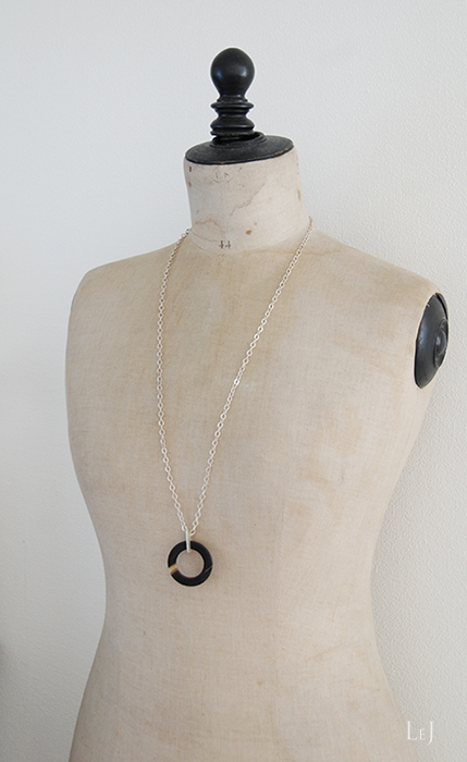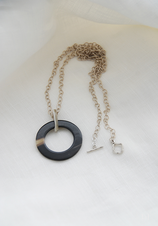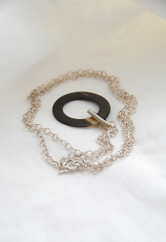 表情ゆたかなボーンのリングをトップにした、クラシックでもありモダンでもあり、自然素材の温かみを感じさせるネックレス、Cara(カーラ)。