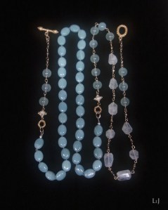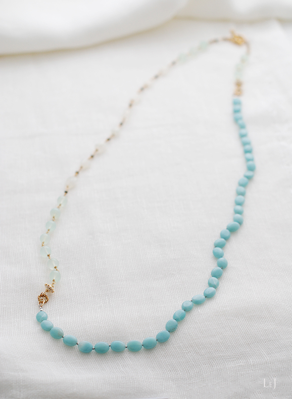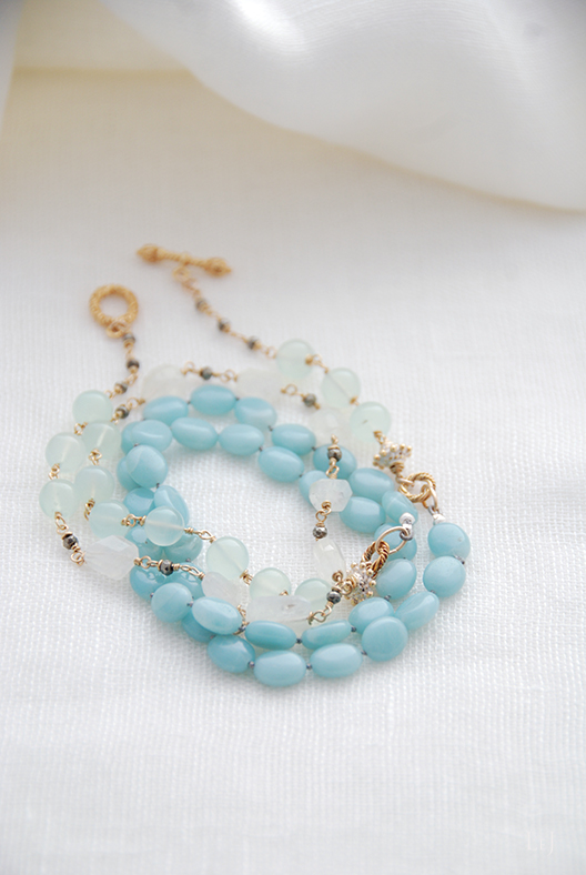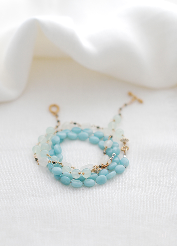アマゾナイトのベビーブルー、ミントグリーンのカルセドニーとホワイトムーンストーン、パイライトやロープ形状のリングやヴェルメイユのゴールドでスイートな華やぎを。夏の陽射しをあびて、サマーセーターやドレスに。ゆるやかなラインを描きながら、ウエアにやさしくフィットします。ホワイトやグレイ、リネン素材のサンドベージュにもよく合います。
