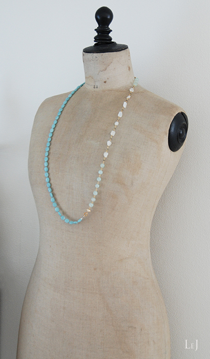 95cmのゆとりのある長さで、二連にしたりラリエットにして結んだり、5連のブレスレットに。金属パーツはK14ゴールドフィルドとヴェルメイユ、アーティスティックワイヤー、シルク糸。
