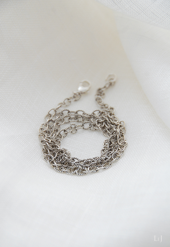シルバー925の持ち味である重厚感がありながらも燻しすぎないプレーンさで、ほどよい落ち感のきれいなラインを描きます。リングを通した際にバランスの良い62cm、チェーンひと目の長さ5mm。リングをお求めいただいたお客さまに定番商品としてお届けします。
