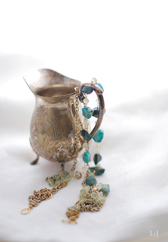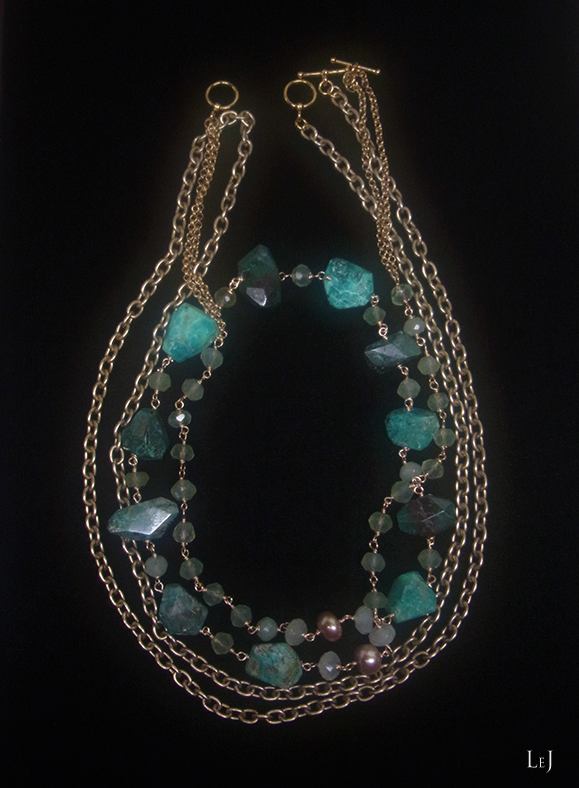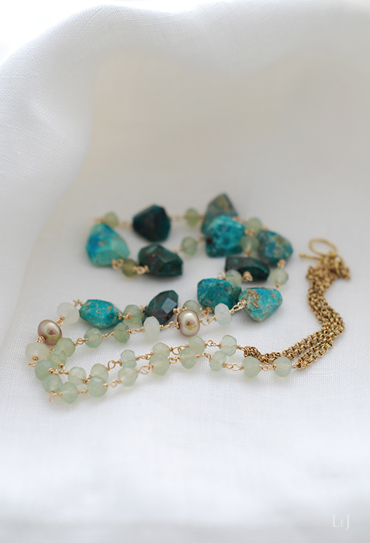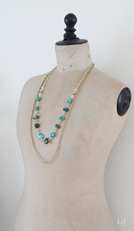 クリソコラとゴールド色のパール、丁寧なカットが揺らめく色を引き立てるグリーンジェイドを丁寧に紡いでロングネックレスにしました。デザインは二連に、一連でも着けていただけるように、留め具を分けました。チェーンのネックレスは、二連にしてショートネックレスとしてもコーディネートしていただけます。
