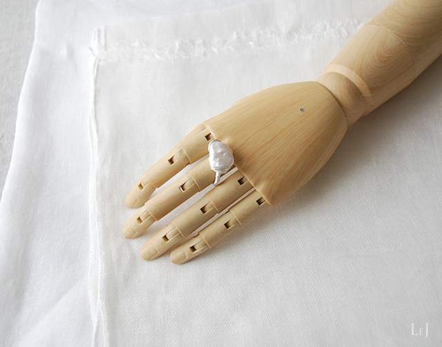 パールの凹凸をそのまま活かして、ワイヤーでしっかり支えています。リングゲージで計ったサイズ:19号。ワイヤーはアーティスティックワイヤー。人差し指や中指に、パールの大輪の花を咲かせてください。