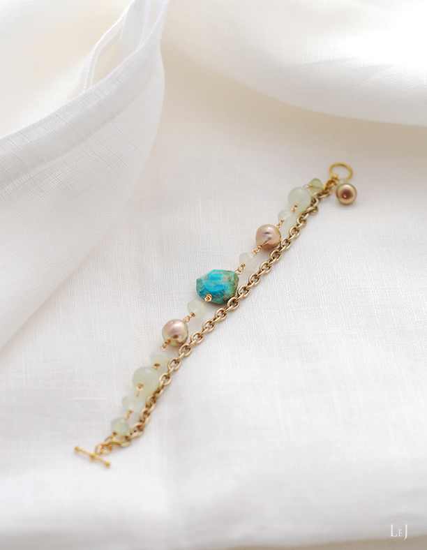 センターのクリソコラにバロックパールのゴールドが甘さを添えて、丁寧なカットのグリーンジェイドがチェーンのゴールドとリストでとろけてしまうようなブレスレット。金属パーツはアーティスティックワイヤーとヴィンテージ加工したブラス。全長18,5cm。リスト周り17cmのかたにほどよくフィットします。