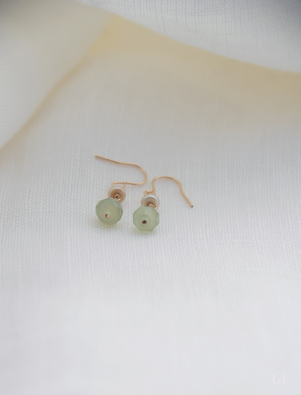 ピアスは、グリーンジェイドとちいさなパールで。とてもシンプル、ネックレスと合わせてどうぞ。ピアスホールからの長さ25mm。