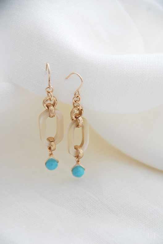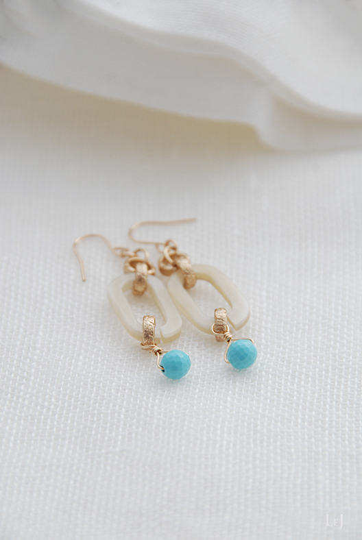 表情ゆたかなボーン素材のリングをやわらかなゴールド色とターコイズに合わせたピアス、 Gisèle3 のアクセサリーページを公開しました。
