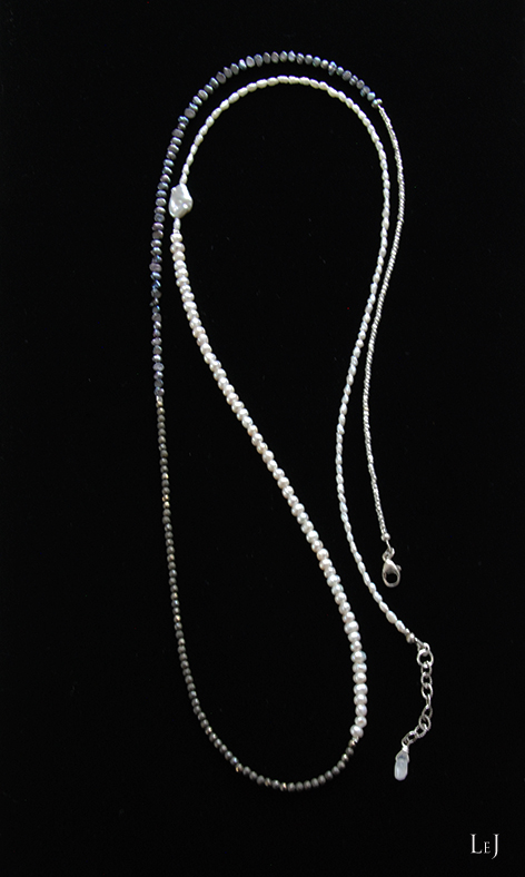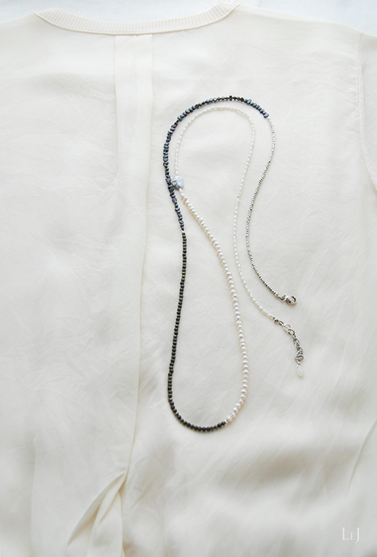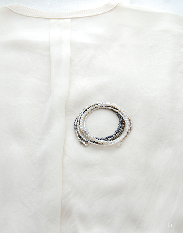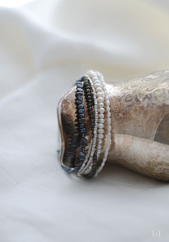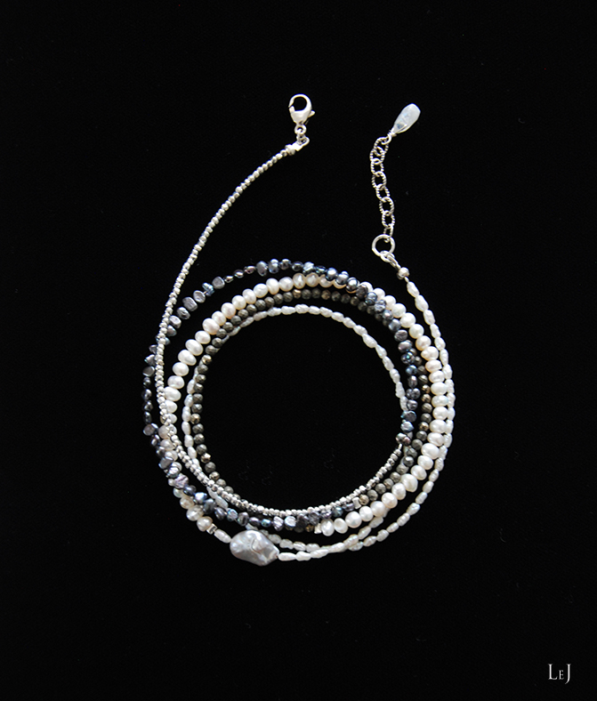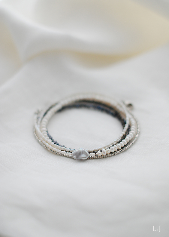 バングルのようなラインを作れるワイヤーを使って、4種類のパールと繊細なカットのパイライトを丁寧に選んで、シルバー色のパーツとマリアージュ。とても細いのに、しっかりとした存在感。それぞれの素材がきらきら光って、リストを飾ります。素材はLeJが長い年月を掛けて集めて来たものばかり。その素材を、美しいアールを保てるようところどころで留めています。