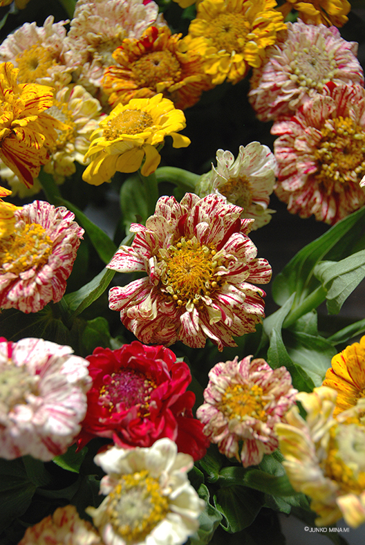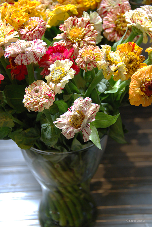 金曜日、駅に向かう花屋さんで出会った、ペパーミントスティックという種類の百日草です。