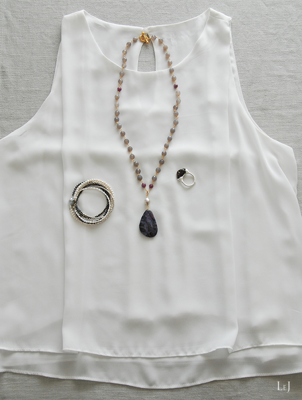 LeJのアクセサリーはどれも、アクセサリーが一人歩きするのではなく、コーディネートの楽しさを感じていただけるように作っています。とくに、Dominiqueはヨーロッパの色合いでまとめて、とてもレアなスギライトをトップにして、ルビーを散りばめたもの。本当は手放すのがさみしいくらいに大好きなネックレスです。
