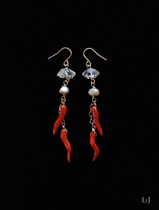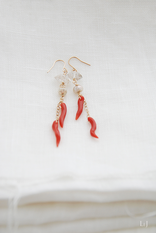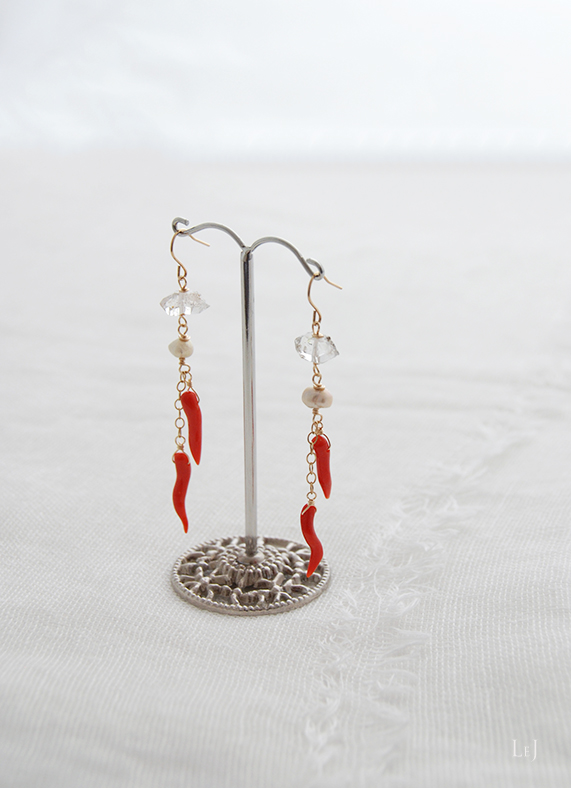 クリアレッドのこの珊瑚は、なめらかでとても美しいもの。ほんのりレッドにころんだシャンパン色のパールやハーキマーカットクオーツと合わせています。きれいなラインで下がるように、慎重にパーツを選びました。試作品は私自身が使い、商品化したものです。とっておきのピアスを、お客さまにお届け出来ればと思います。