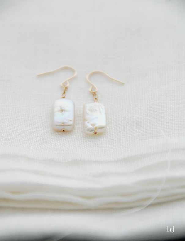 クリーミーホワイトの穏やかな光沢を放つ、レクタングルカットのパール。ゴールドとよく合って、シンプルだけれど存在感のあるピアスになりました。