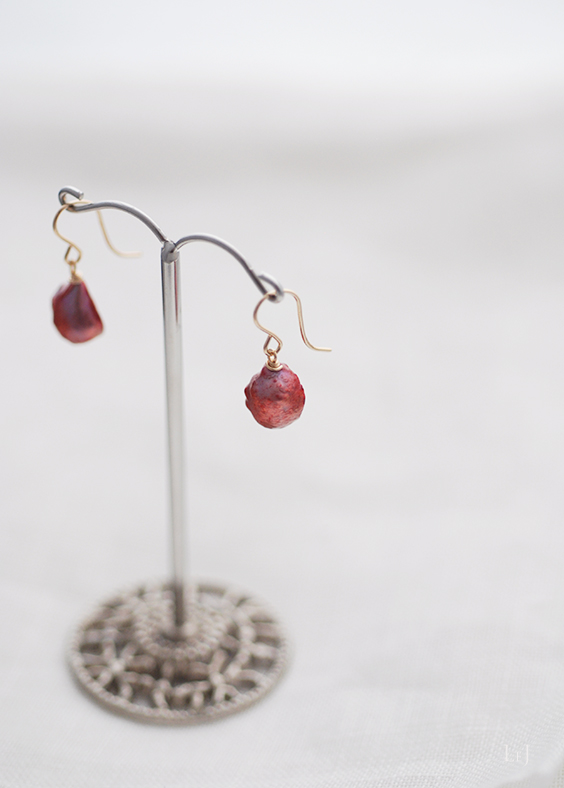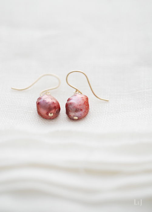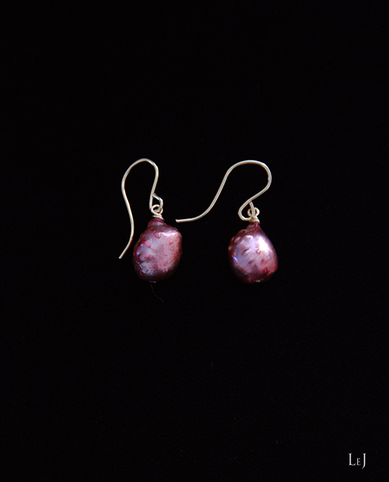 抑えたベリー色のパールが耳元でゆらゆら揺れるピアス。光沢があって、バロック形状が表情ゆたか。ピアスホールからの長さ24mm。金属パーツはK14ゴールドフィルド。