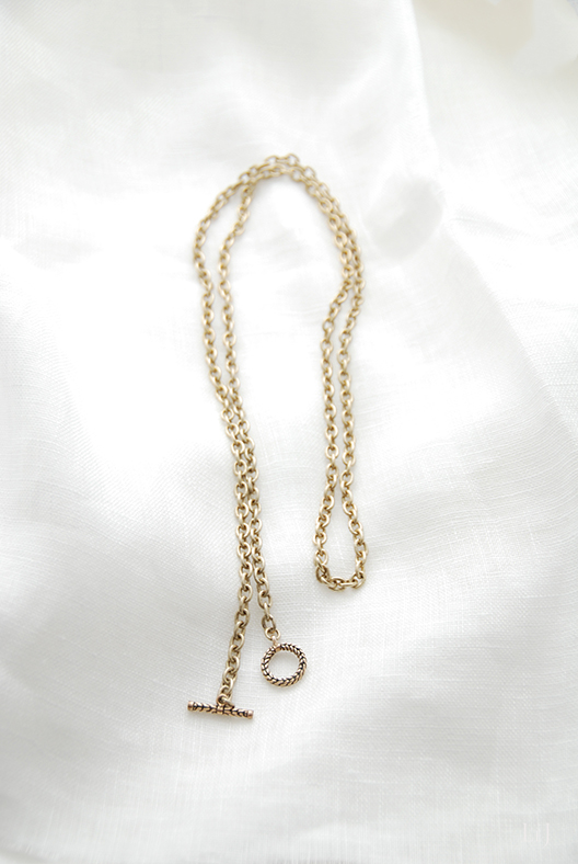 ボリュームのあるほかのネックレスにレイヤードすることで、雰囲気に奥行きを添えます。アンティーク加工ブラスの商品です。