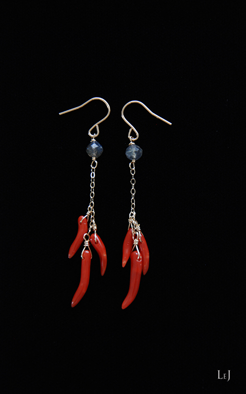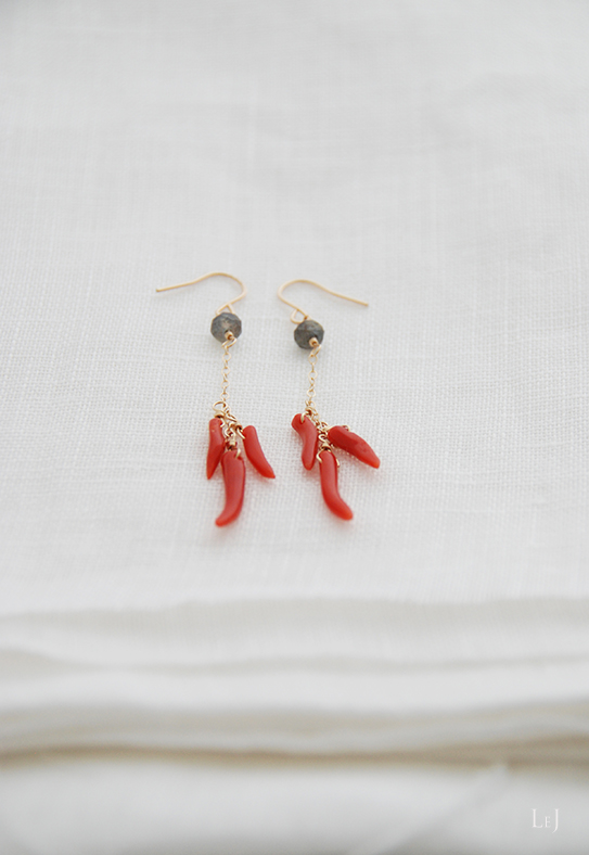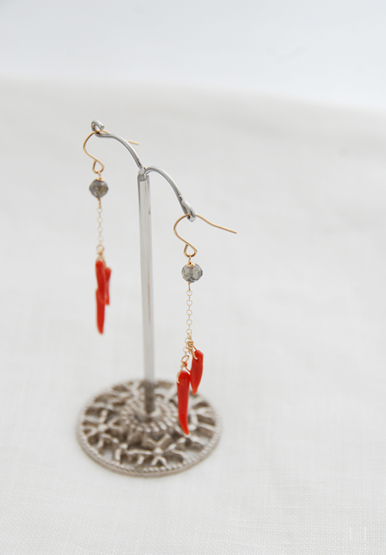 クリアレッドのこの珊瑚は、なめらかでとても美しいもの。オーバルのチェーンを添えて、丁寧なカットのラブラドライトと一緒に、きれいなラインで下がるピアスにしました。