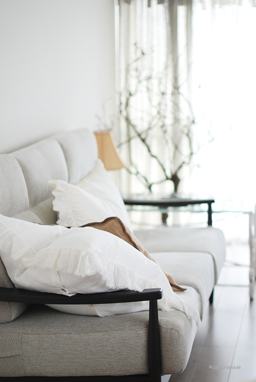 6ヶ月間ずっと考えていた、ソファの買い換えをしました。家族や友人と話しやすいですし、横になってiPadで遊んだり。大好きなクッションやクロスで、ソファをもこもこにしています。三人掛けのソファは、ネットでもずいぶんあちこち探しましたが、結局はシンプルな国内産に決めました。とても気に入っています。