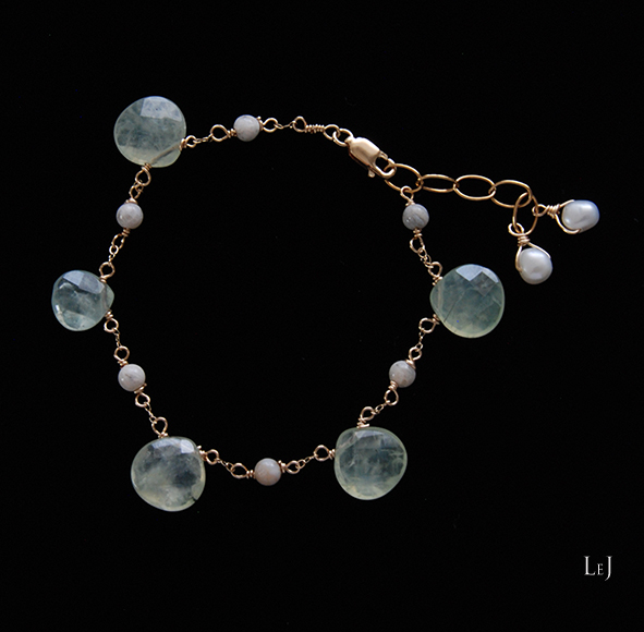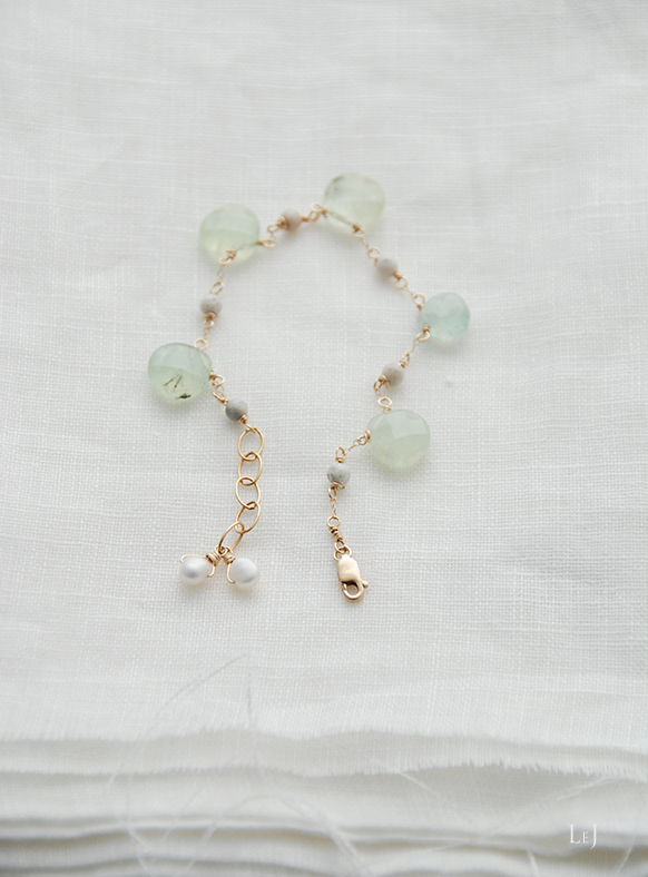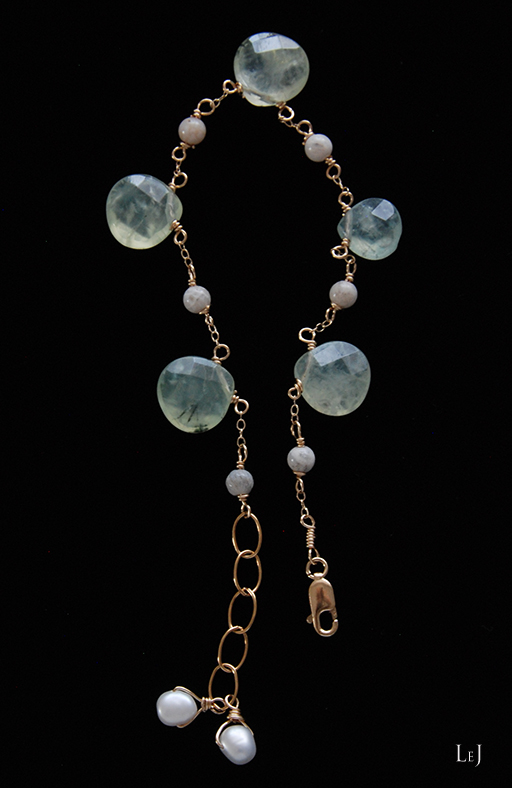 マスカット色のプリナイトと大理石のような風合いをもつフォッシルコーラルアゲートをK14ゴールドフィルドのチェーンで繋いで、秋の果実のようなアクセサリーにしました。ノーブルなアジャスターのチェーンの先には、穏やかな光沢の淡水パール。LeJのブレスレットは、着けやすくて一周どこから見ても美しいように工夫しています。