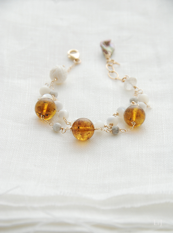 エキゾチシズムあふれる、アンバー(琥珀)に白い天然石を合わせたブレスレット Amalfi12