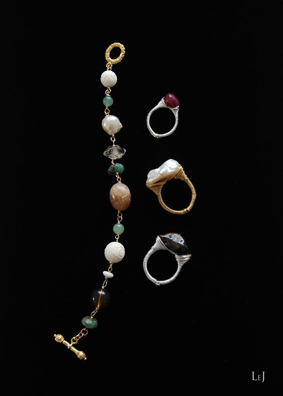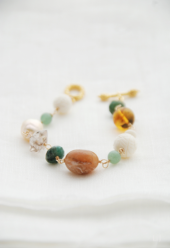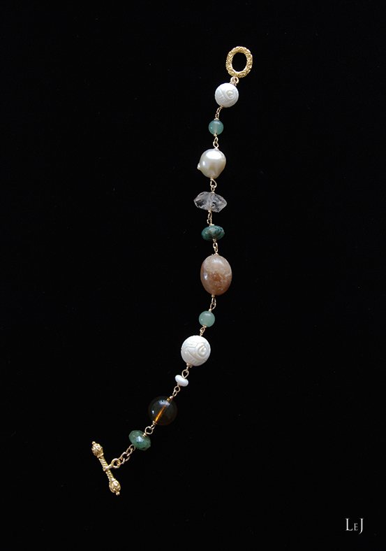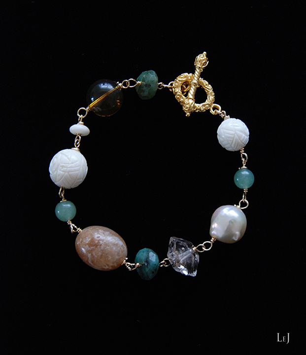 一番下の画像の素材、上から。二種の大きさのカーヴィングボーン、翡翠、バロックパール、ハーキマーカットクオーツ、エメラルド、オパール、翡翠、ボーン、ホワイトシェル、アンバー、エメラルドなど。