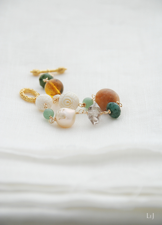 革小物との相性もぴったり。シンプルなセーターなどのウエアに表情を添えます。ふわっとしたセーターの袖口に。デニムに合わせて。穏やかな色だけれど、ちゃんと個性を持った、LeJらしいブレスレットです。