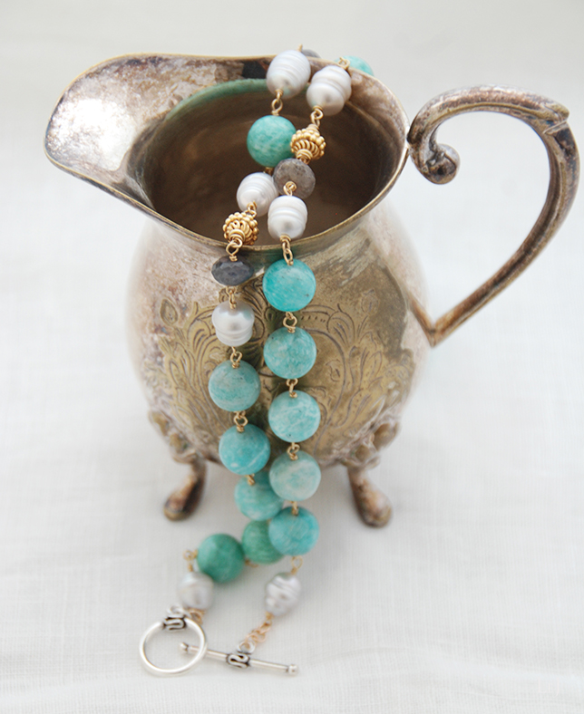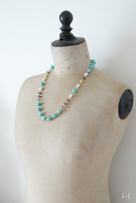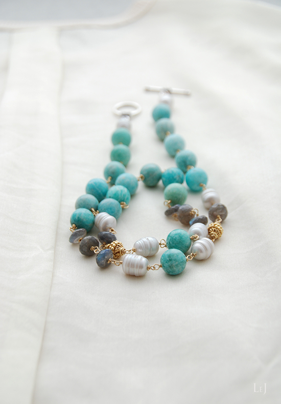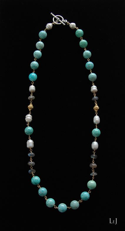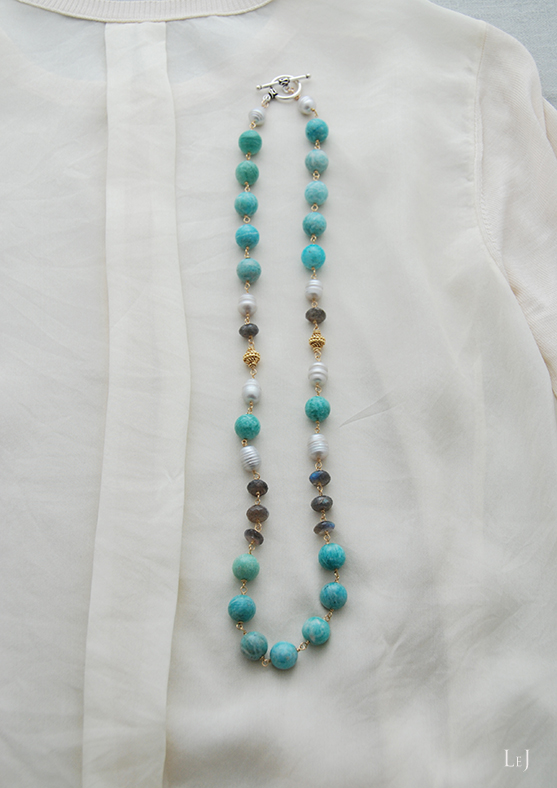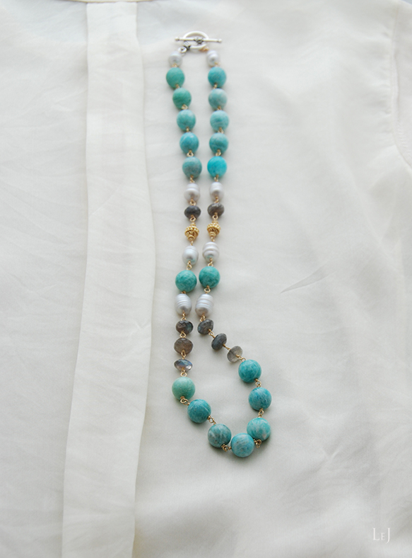 エメラルドグリーンとオーシャンブルーがマーブル模様のような美しいマチエールを描くロシアンアマゾナイト、落ち着いたシルキーホワイトのパールとラブラドライトのネックレス、Milana(ミラナ)。