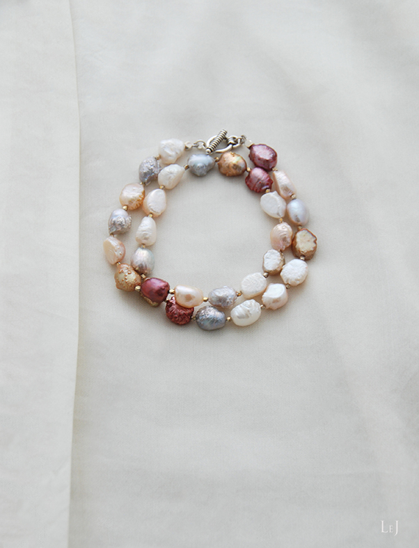 適度な光沢があって、発色に気品を感じられるのにスイートも持ち合わせているパールは、ありそうでなかなかないもの。長さ42cm。金属パーツはK14ゴールドフィルドとシルバー925。セーターの上にぐるぐると二連のブレスレットにすると、とっても可愛い雰囲気を出します。