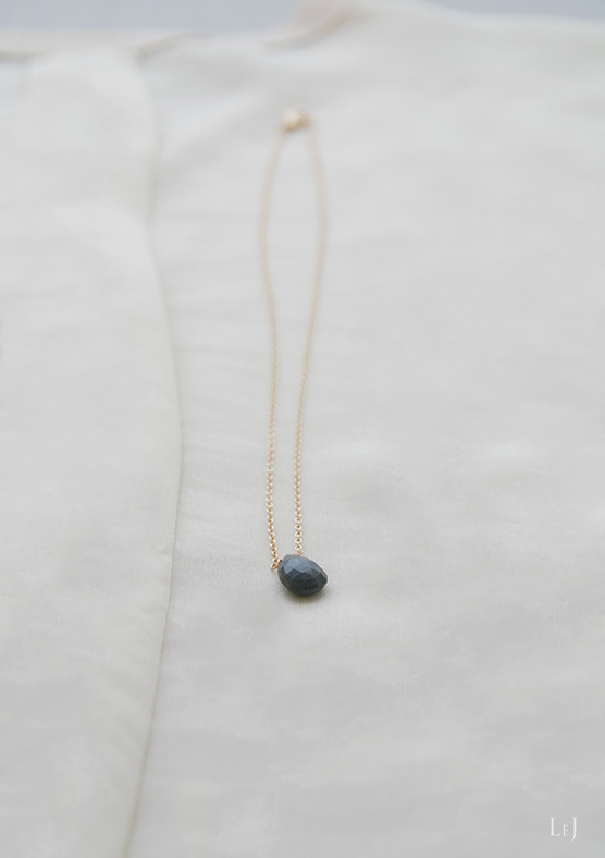 一点目のネックレスは、ブルーサファイアの一粒ネックレス。ミッドナイトブルーの粒は12mm×8mm×6mmの厚さで、大きな粒には月の夜の空に似た静けさを感じます。プチネックレスというよりも、しっかりとした重みのあるペンダントの雰囲気。着けると、光をシャープに反射してきらめきます。