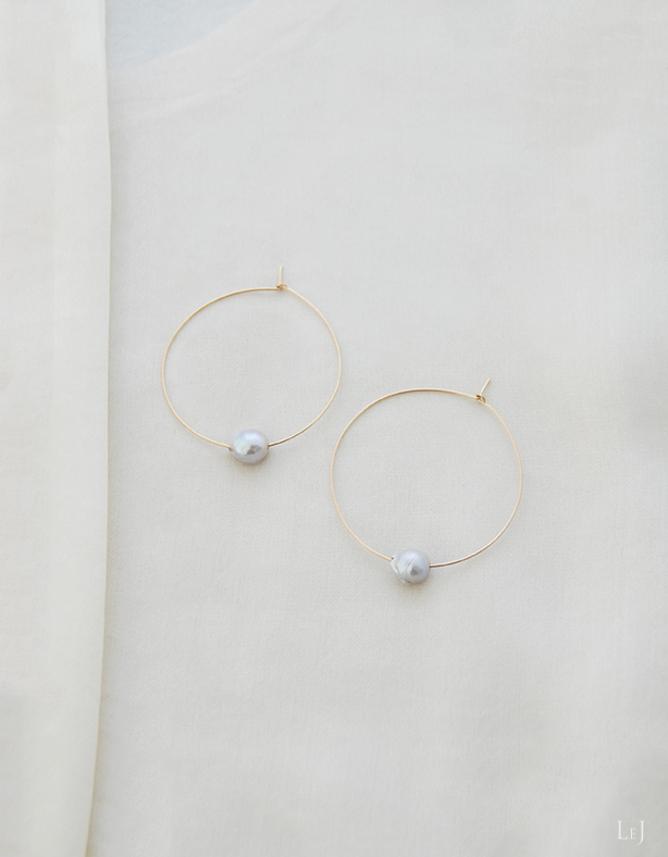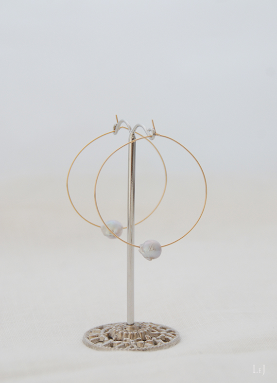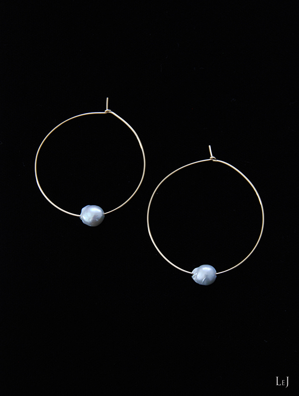 この冬は素敵なパール素材をたくさん揃えることが出来たので、思い切ったフープピアスも積極的に作ります。8mm×7mmのパール、⌀45mmのピアスはお顔の横でゴールドとグレイがよく映えて、明るい空気を生み出します。
