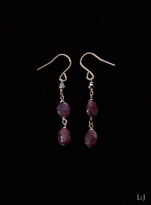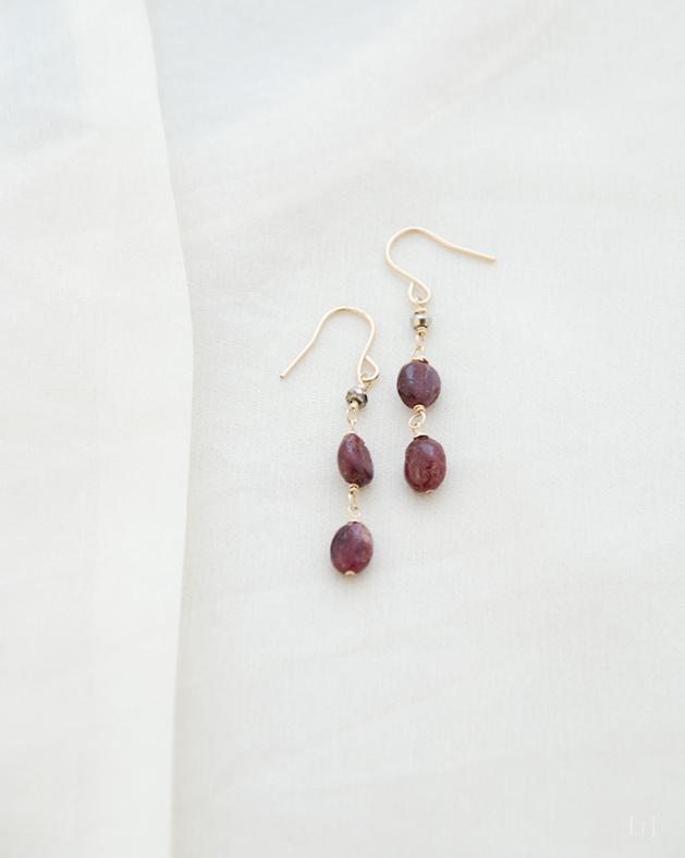 カシス色のピンクトルマリンをふた粒、そしてパイライトを添えたピアス、Adria2。