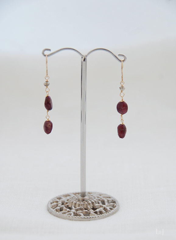 LeJのピアスをコーディネートした画像では左端に写っています。ピアスホールからの長さは38mm。数点の再制作をすることがあります。金属パーツはK14ゴールドフィルド。