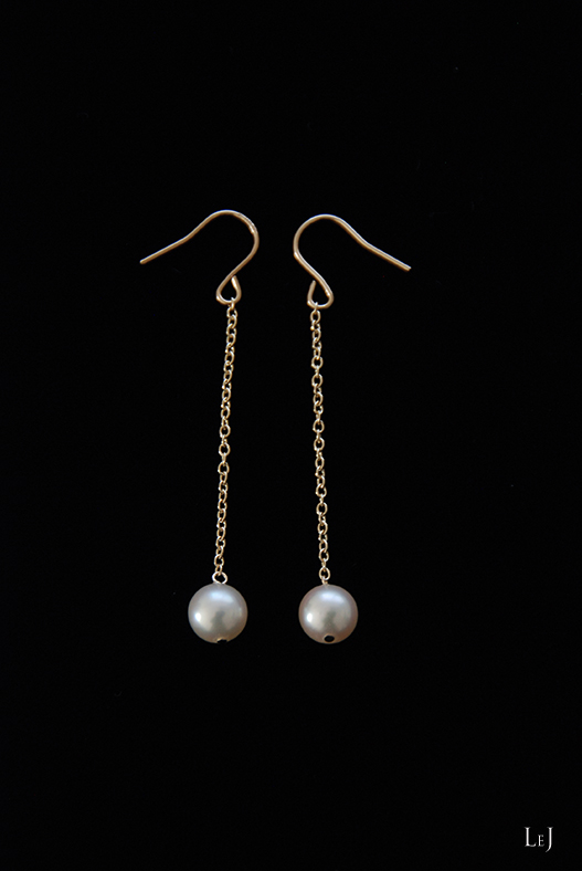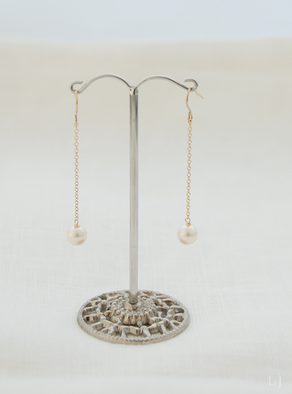 あこやパールは⌀8mm。ピアスホールからの長さは52mm。金属パーツはK14ゴールドフィルド。3点分ほどのストックがありますが、パーツの状態によります。お目に留まった時にお申し付けください。コーディネートの画像では、上部なかほどに写っています。