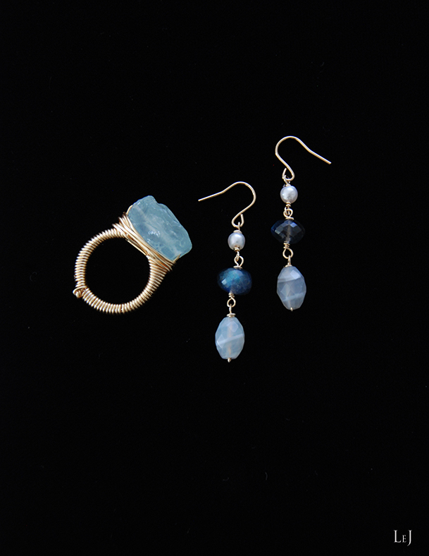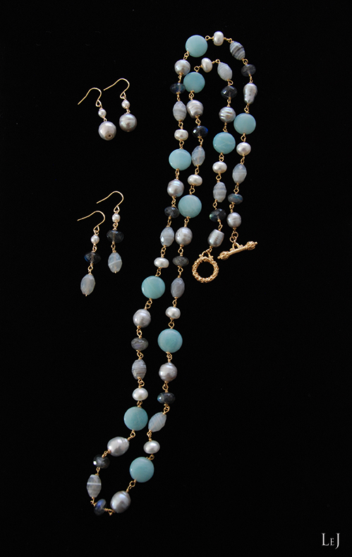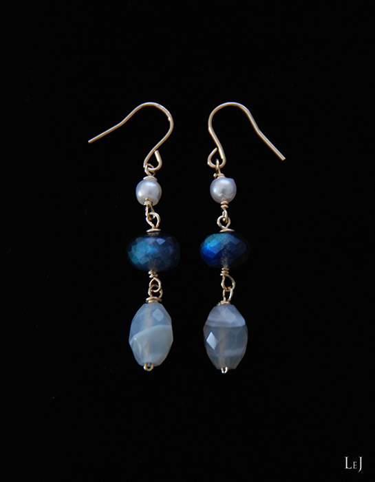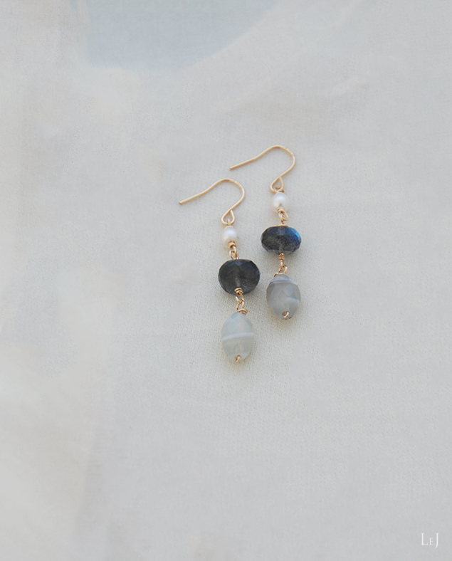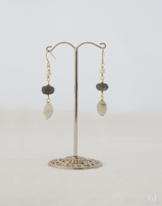 小さいけれどくっきりとした光沢を持つあこやパール、カットとシラーが美しいラブラドライト、ほのかなグレイ&ホワイトのマチエールを持つアゲートのピアス、Donna-p。