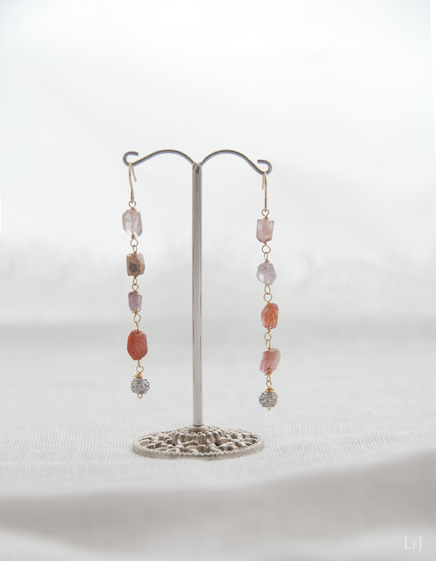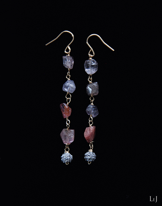 スピネルの下には、きらきらしたラインストーンを散りばめたパーツ。揺れる度に表情を作ります。ピアスホールからの長さ63mm。金属パーツはK14ゴールドフィルドとメタル。