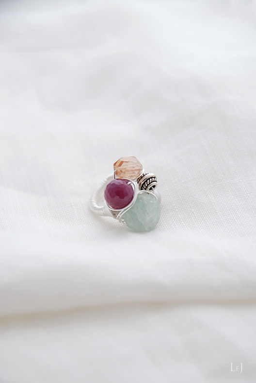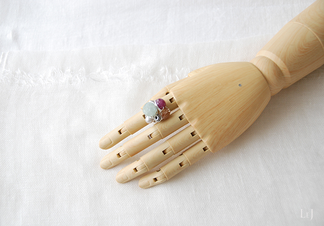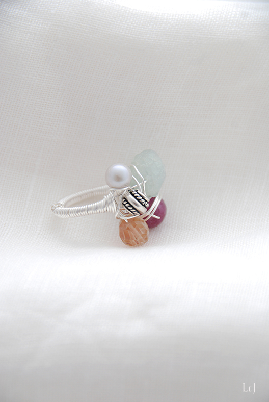 アイスブルーのアクアマリン、⌀10mmのルビー、ハイクオリティのサンストーン、パールやシルバー925パーツをしっかりとワイヤーでくるんだリング、Fiore19。