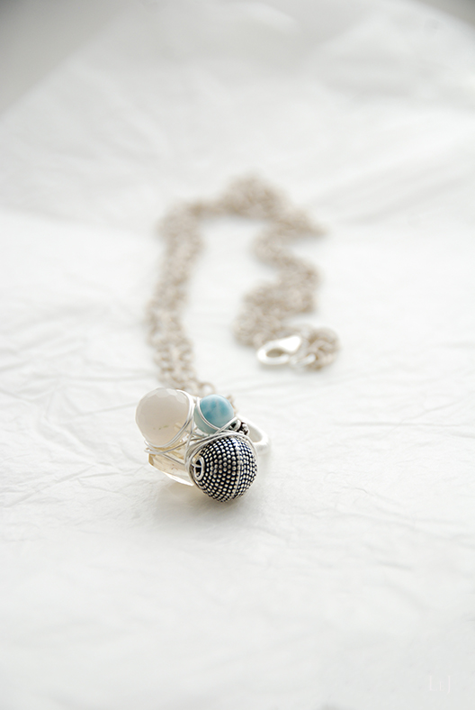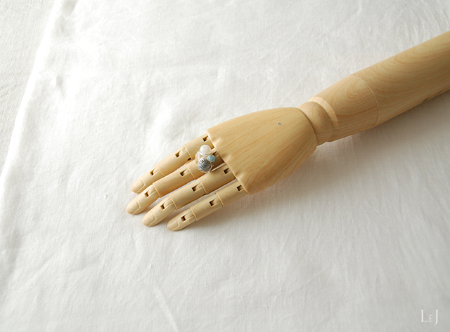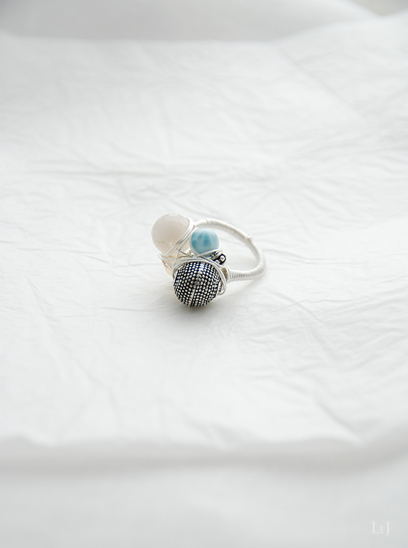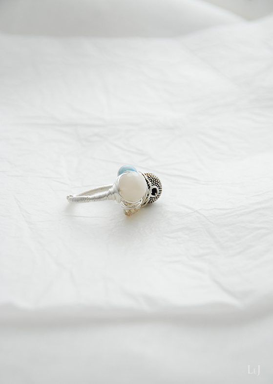 ころんとしたムーンストーン、ラリマー、サンストーン、シルバー925パーツをしっかりとワイヤーでくるんだリング、Fiore21。