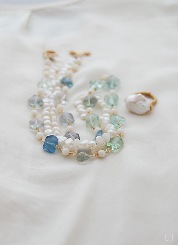 グリーンからブルーへと展開するフローライトをファセッテドラウンドのホワイトコーラルで繋ぎ、シルキーなパールと二連にしたネックレス Lilica