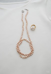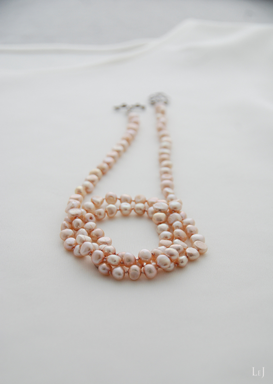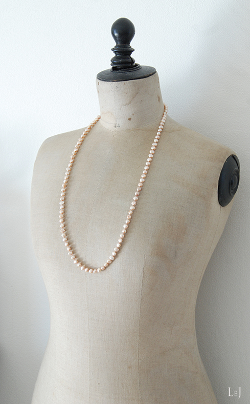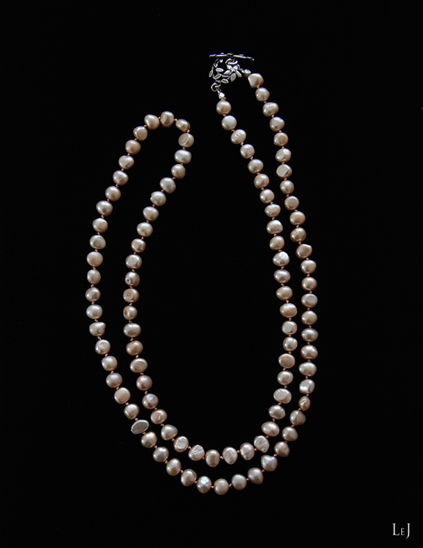 抑えた穏やかなトーンのパールを、同じ色のシルク糸で優しいラインを作り、80cmに仕立てました。ほんの少し華やかで、デイリーに使えて、肌馴染みのよいアクセサリーです。粒はポテト型の7mmほど。金属パーツはシルバープレイテドブラス。