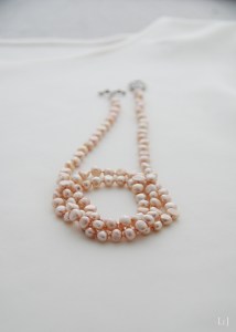 オレンジがかったピンク、ピンクがかったオレンジの淡水パールをシンプルにネックレスにしたMonic。