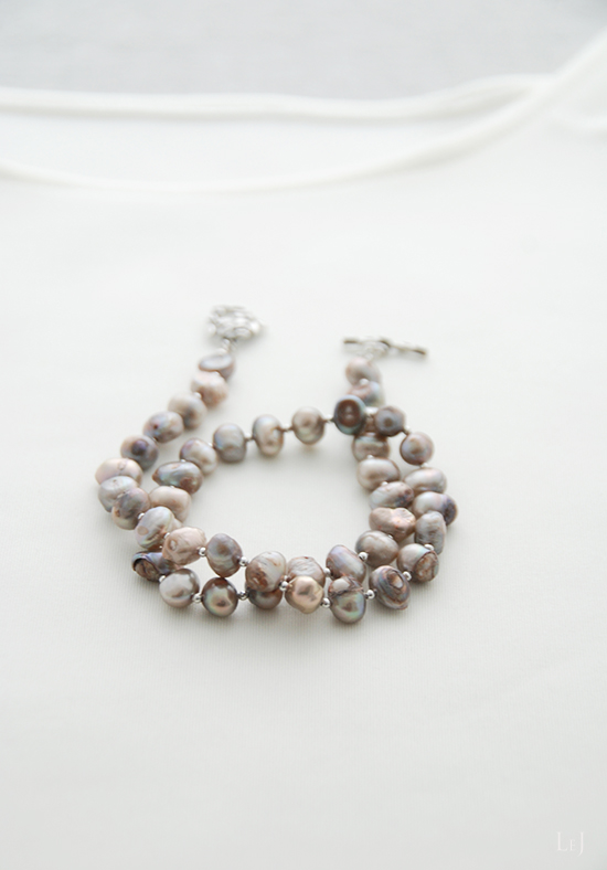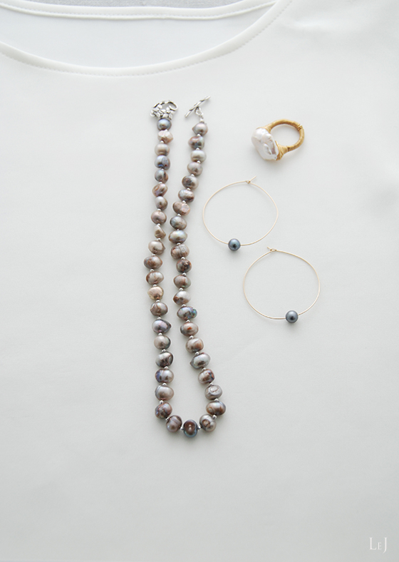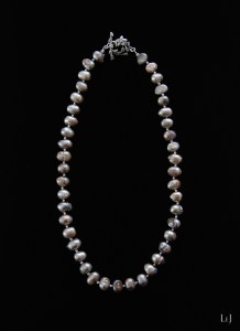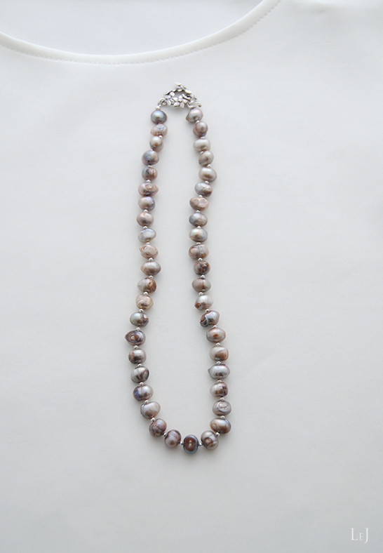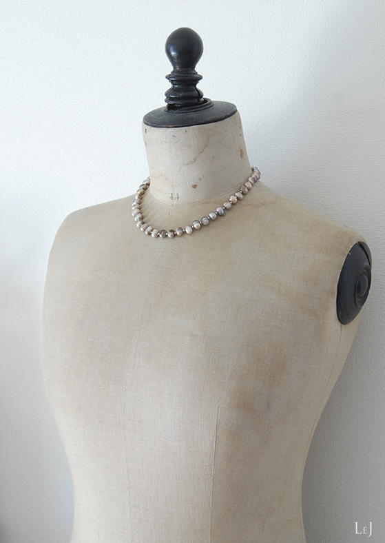 一粒ずつノットを入れているので、デコルテで美しいアールを描きます。留め具もアンティークテイストのものを合わせて。シンプルなインナー、ジャケットにも。シルバー色のお手持ちのアクセサリーとのコーディネートもお楽しみいただけます。