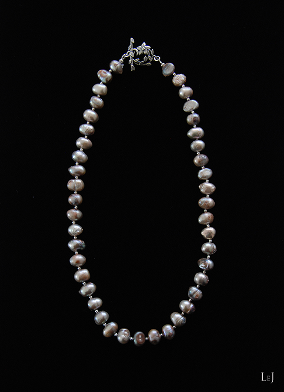 長さ43cm。パールは7mm-10mm。金属パーツはシルバー925、シルバープレーテドブラス、メタル。シルク糸。+3cmまでの調整は無料で承ります。