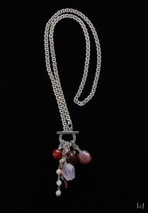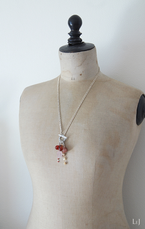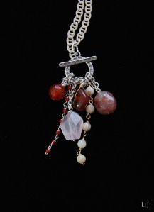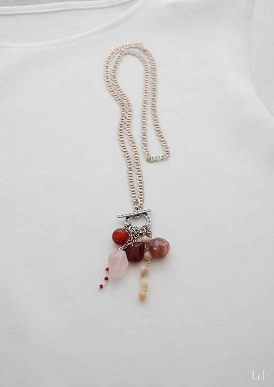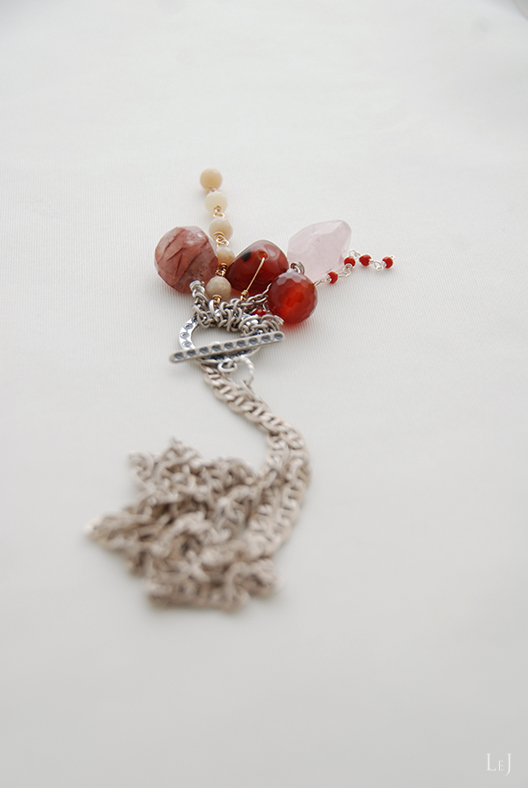マットシルバーのパーツに集まった、いろいろなトーンの素材は、サンセットオレンジクオーツ・カーネリアン・ローズクオーツ・レッドアゲート・アフリカンオパールとレッドコーラル。
