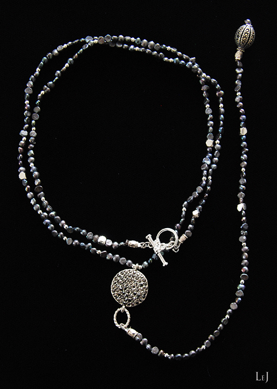 とくに、このところのシルバー色のパーツの進化は目ざましいと感じています。業者さんの工夫の賜なのですけれど、そのきっかけになったのは、金属価格の高騰です。少し前まではシルバーとゴールドと言うとsilver925とK14ゴールドフィルドが主流でしたが、あまりの価格の高騰によって、かえってブラスを独特の風合いに仕上げたものなどのバラエティが豊かになりました。マットか光沢か、エッジの始末や手に取ったときのボリュームや感触、青いシルバー色か温かみのあるシルバー色か、糸や線材を通したときに描くアールなど、選ぶ段階でデザインを考えています。プレーテドという表現はめっきのことで、LeJでも積極的に使っています。