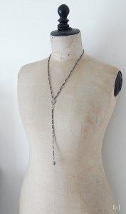 パーツには、Y字部分のメタルにぎっしりとストーンを埋め込んだものや、エンド部分のシルバー925に丁寧にマーカサイトを細工したもの、シルバー925の縄状のリングなど。ネック部分の長さ58cm、センターパーツからの長さ21cm。