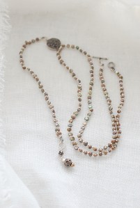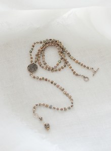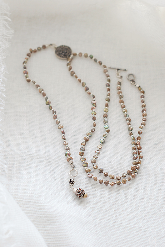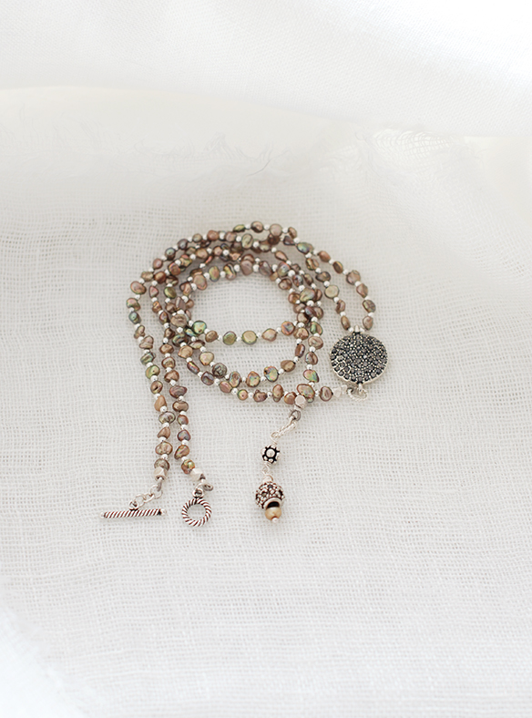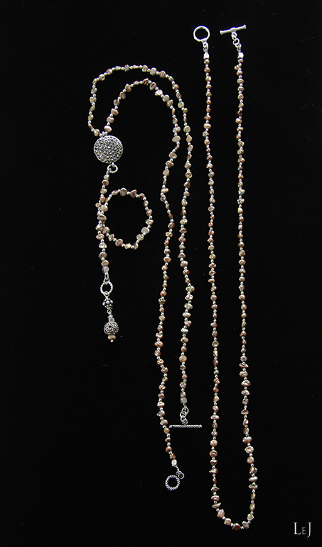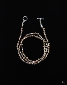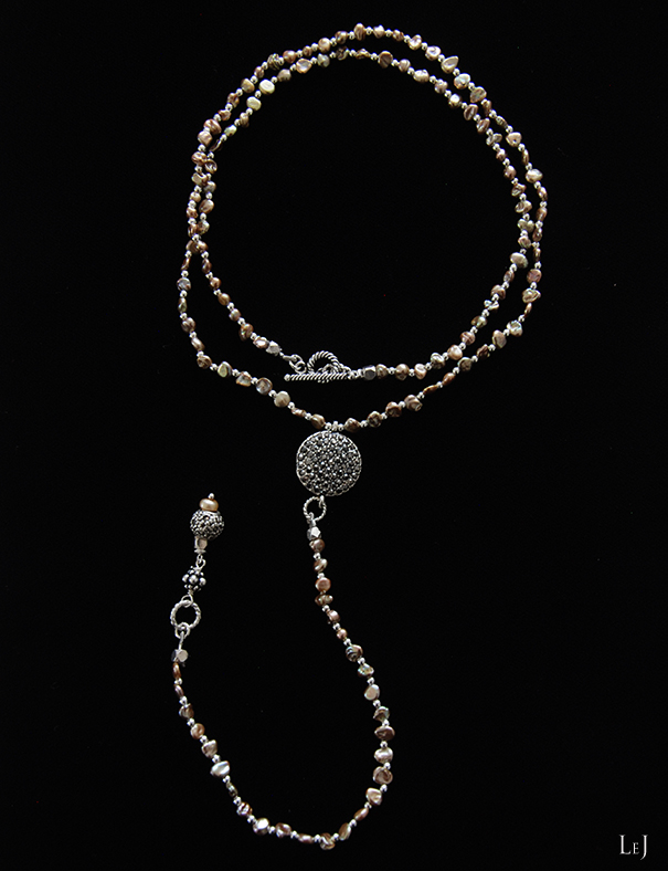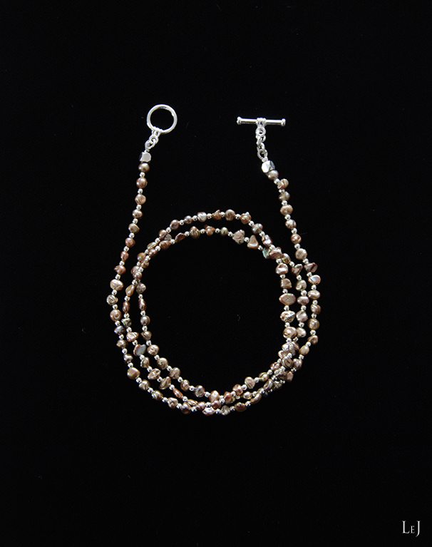 同じパールで、56cmのショートネックレス Dolcevita4 を作りました。けしパールの陰影が深みを出して、シルバー色パーツと美しいコントラストを作ります。3連のブレスレットとしてもお使いいただけます。普段は大粒のネックレスをお着けになるかたにもお薦めします。適度な落ち感が心地よいアクセサリー。ぜひ、二点お揃いでどうぞ。
