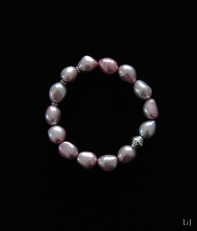 Cloé2(クロエ2)は、ハイクオリティのバロックパールのブレスレット。モーヴピンクがとてもスイートながら、質感としては硬質的。麻のシャツと合わせたりと、大人の女性に十分着けていただける、上質なパールです。