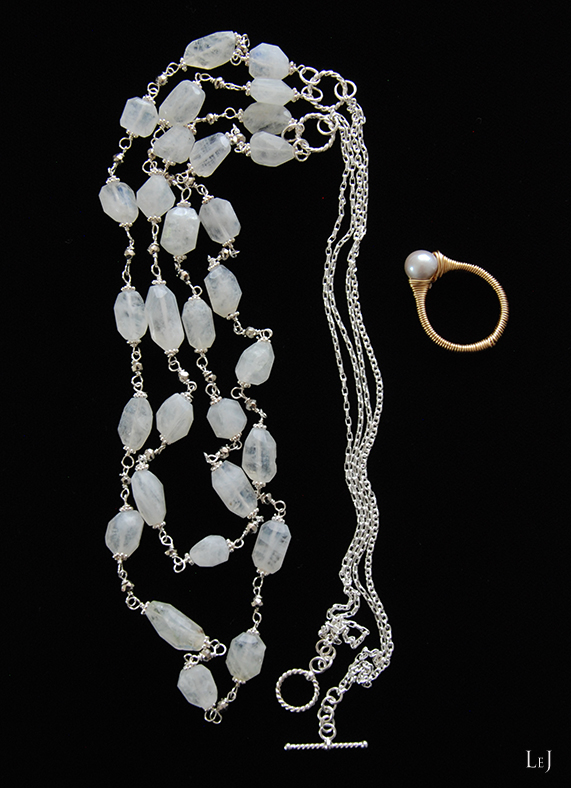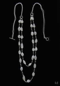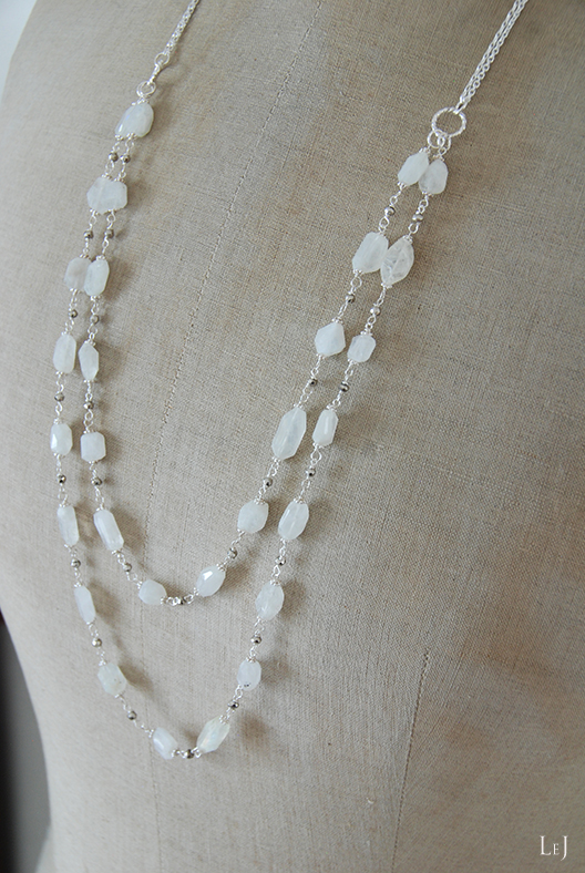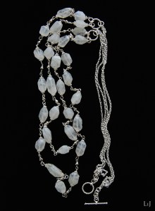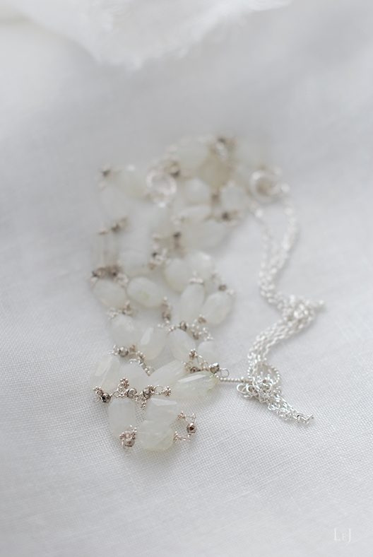 ニュアンスのあるラブラドライトをシルバーパイライトと一緒にめがね留めで紡ぎ、リングやチェーンに拘って、透明感のあるアクセサリーになりました。ほどよい重さと美しいラインを描く、イノセントでモダン、アンティークテイストも持ったネックレスです。