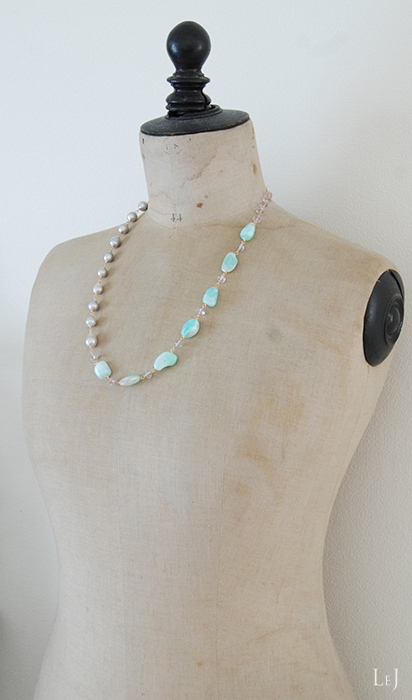 大粒のバロックパールと美しいマチエールを描くブルーオパール、秀逸なカットがきらきら光を放つピンクアメジストのネックレス Amalfi21。