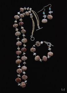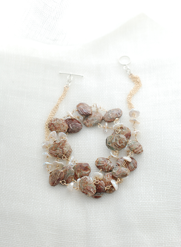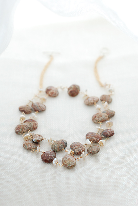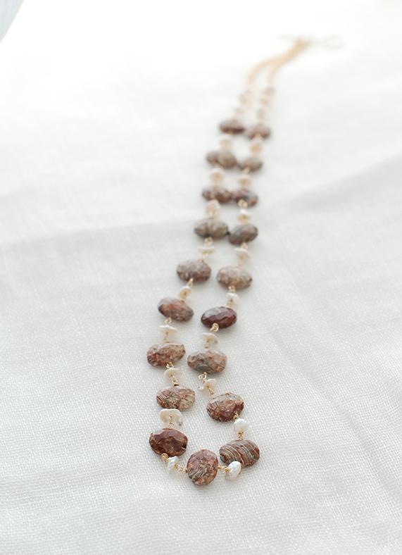 きれいなカットがされたゼブラジャスパーと美しい光沢のけしパール。ゼブラジャスパーは15mm×10mm×5mmほどで、カットの光沢がとても美しく、感じのよい素材。K14ゴールドフィルドワイヤーとシルバー925のマンテルが、しっとりとした落ち着きを持っています。