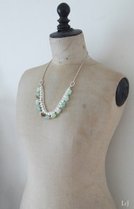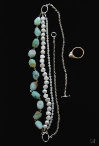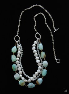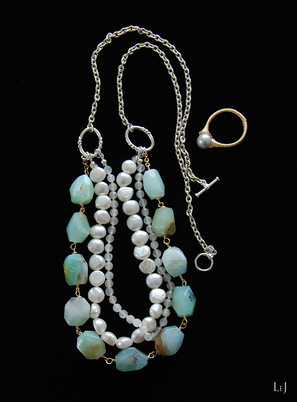オパールがお好きなかた、ムーンストーンがお好きなかたには堪らないネックレス。夏のウエアはもちろんのこと、黒いタートルやグレイのセーターにも映えそうなアクセサリー。