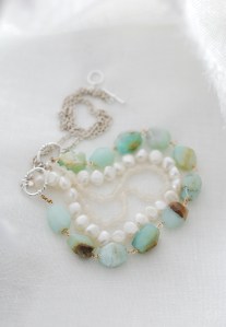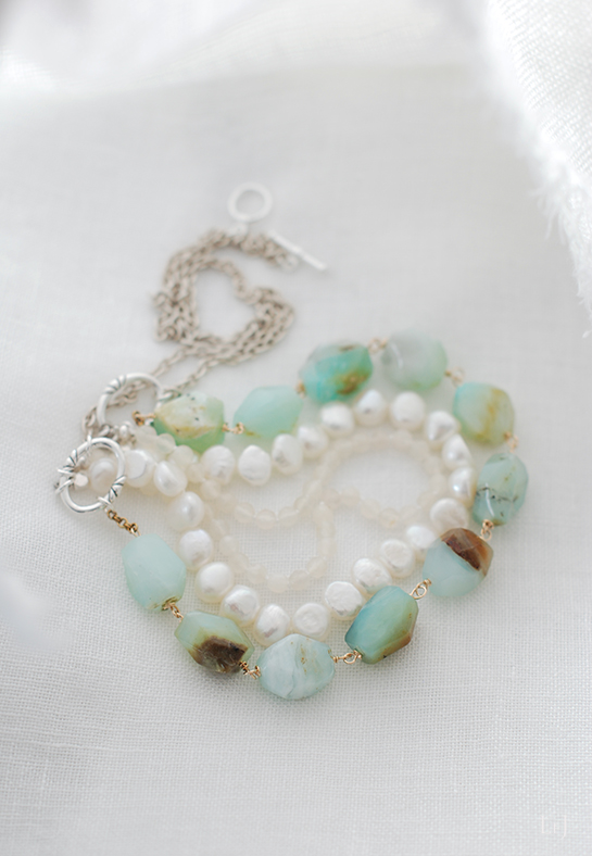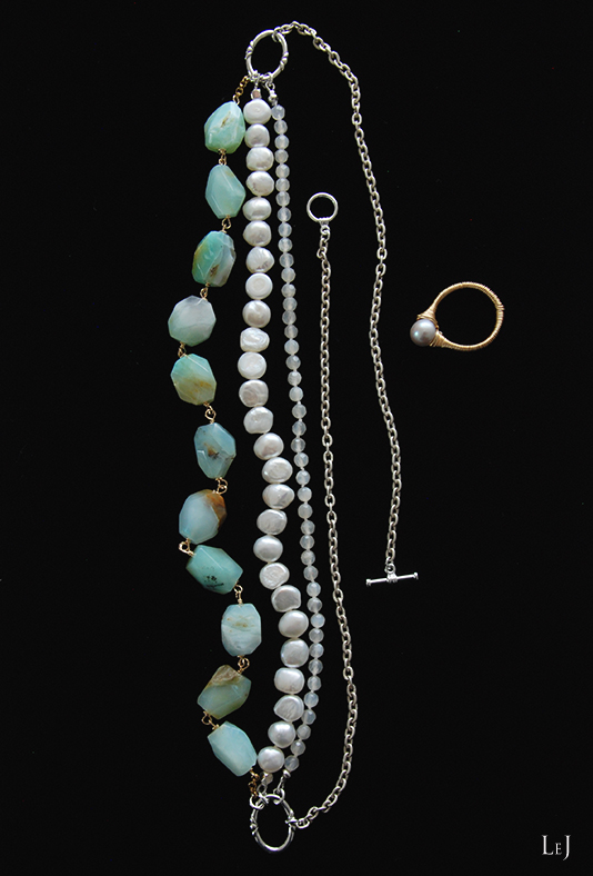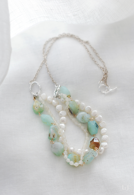 オーシャンブルーのマチエールを描くブルーオパール、とろけてしまいそうな美しいカットのムーンストーンと淡水パールをエッセンスにして集めたネックレス Shella(シェラ)。