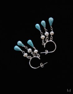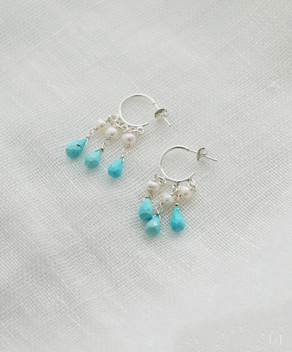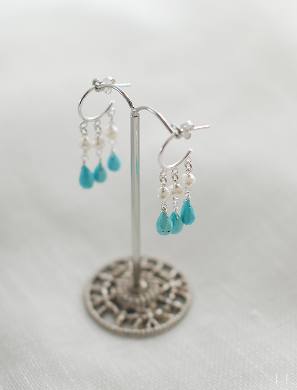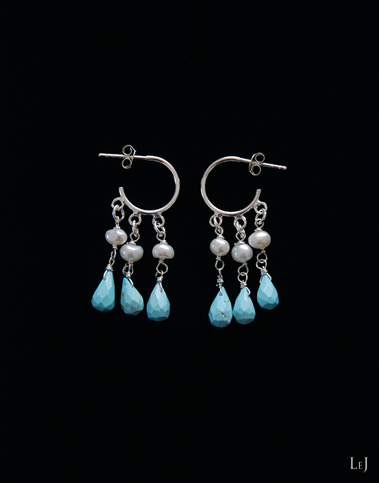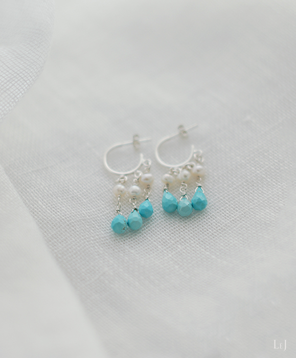 私が自分のために作ったピアスを、そのまま商品化したものです。スリーピングビューティターコイズは、年々希少なものになって来ています。長い時間を掛けてLeJのストックに集めて来たターコイズは宝もののような存在になりつつあって、このターコイズの魅力を最大限に引き出せるように考えました。