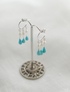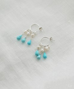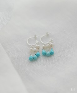 晴れ渡った空のようにクリアなブルーのスリーピングビューティターコイズのブリオレットと、ほどよい光沢の淡水パールのピアス Amalfi22。